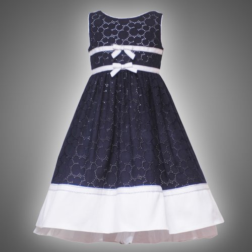Beautiful NAVY-BLUE & WHITE EYELET DRESS features sleeveless bodice with round neckline and DOUBLE GROSGRAIN RIBBON & CENTER BOW TRIM with contrast stitching at the waist. Fully lined NAVY-BLUE SKIRT features EYELET DETAILS with SOLID WHITE BORDER & RUFFLED TULLE HEM plus attached slip with ruffled crinoline underskirt for added fullness and back zip closure with BOW TIE SASH IN BACK. Machine washable. Imported. Of polyester/cotton - Lining of polyester/cotton/nylon - Exclusive of trim/decoration. Matching/Coordinating sister styles available in sizes 3M-16, search for style(s): RRE-37371. More baby & girl party dresses available, search for: " rre-girl-party-dress " Read more...