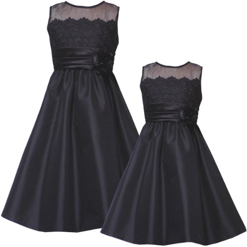 Beautiful BLACK ILLUSION LACE & TAFFETA DRESS features sleeveless METALLIC/LUREX LACE BODICE with SHEER ILLUSION NECKLINE and SHIRRED SATIN BAND & REMOVABLE FLOWER APPLIQUE at the waist. Fully lined, knee-length BLACK TAFFETA SKIRT features attached slip with ruffled crinoline underskirt for added fullness and back zip closure with BOW TIE SASH IN BACK for perfect fit. Hand wash, line dry. Imported. Bodice of polyester - Skirt of polyester/nylon - Lining of polyester/nylon - Exclusive of trim/decoration. Matching/Coordinating sister styles available in sizes 4-16, search for style(s): RRE-42500. More baby & girl party dresses available, search for: " bnj-girl-party-dress " Read more...