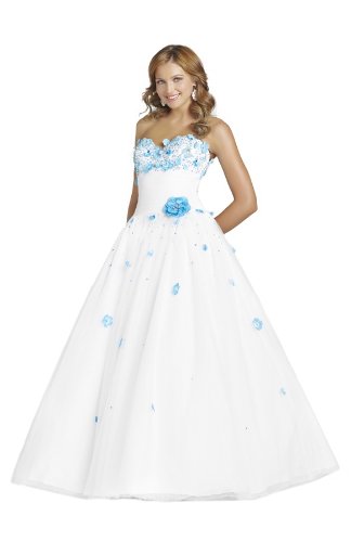 Eye-popping floral accents dot the bodice of this enticing Blush 5031 dress, giving it flair and style. The strapless top is nicely balanced by the sweeping, A-lineskirt; additional floral accents dot the skit, creating a cohesive look. An utterly charming sweetheart neckline tops it all off with pizazz. Read more...