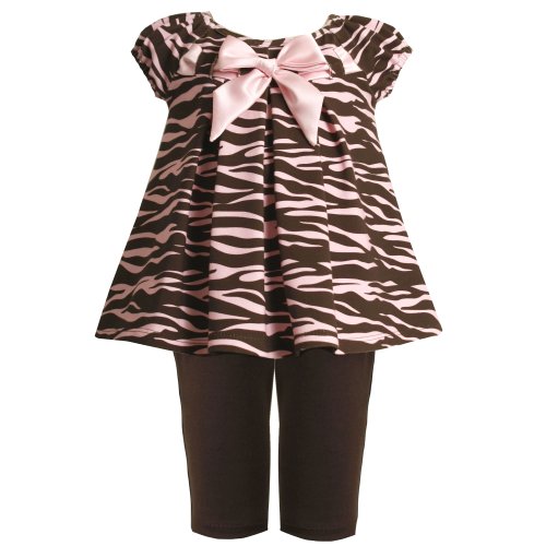 Beautiful BROWN & PINK ANIMAL PRINT KNIT dress/top & legging/pants set features PINK & BROWN 'Zebra Animal Print' DRESS/TOP with PINK PULL THRU SATIN RIBBON & BOW TRIM. Pull-on BROWN KNIT LEGGINGS features comfortable elasticized waist. Machine washable. Imported. Dress & Legging of cotton/spandex - Exclusive of trim/decoration. Matching/Coordinating sister styles available in sizes 3M-4T, search for style(s): BNJ-0857. More baby & girl party dresses available, search for: " bnj-clothing-outfit-set" Read more...