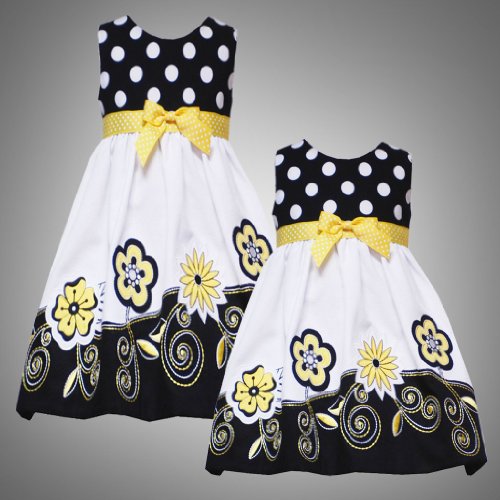 Beautiful BLACK, WHITE & YELLOW FLORAL BORDER DRESS features sleeveless BLACK/WHITE POLKA DOT BODICE with round neckline and YELLOW/WHITE-DOTTED GROSGRAIN RIBBON & BOW TRIM at the EMPIRE WAIST. Fully line, WHITE SKIRT features BLACK BORDER HEM with FLORAL EMBROIDERED & APPLIQUE DETAILS plus back zip closure and YELLOW/WHITE-DOTTED GROSGRAIN BOW TIE SASH IN BACK for perfect fit. Hand wash, line dry. Imported. Bodice of 100% cotton - Skirt of cotton/polyester - Lining of polyester/cotton - Exclusive of trim/decoration. Matching/Coordinating sister styles available in sizes 3M-16, search for style(s): RRE-37311. More baby & girl party dresses available, search for: " rre-girl-party-dress " Read more...