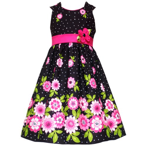 Beautiful BLACK & WHITE MINI POLAKA DOT FLORAL BORDER PRINT DRESS features sleeveless bodice with SHIRRED SHOULDER STRAPS and FUCHSIA-PINK BAND & FLOWE APPLIQUE at the waist. Fully lined, knee-length BLACK & WHITE MINI POLKA DOT SKIRT features PINK/WHITE FLORAL BORDER PRINT and attached slip with ruffled crinoline underskirt for added fullness plus back zip closure and BOW TIE SASH IN BACK for perfect fit. Hand wash, line dry. Imported (Sri Lanka). Of 100% cotton - Lining of polyester/cotton/nylon - Exclusive of trim/decoration. Matching/Coordinating sister styles available in sizes 2T-6X, search for style(s): RRE-53221. More baby & girl party dresses available, search for: " rre-girl-party-dress " Read more...