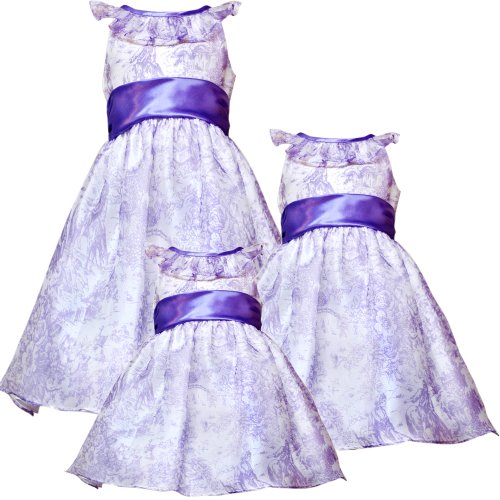 Beautiful LILAC-PURPLE TOILE PRINT ORGANZA OVERLAY DRESS features sleeveless bodice with SATIN & RUFFLE TRIM at the round necklinel plus PURPLE SATIN BAND at the EMPIRE WASIT. Fully lined WHITE SKIRT features LILAC-PURPLE TOILE PRINT ORGANZA OVERLAY and attached slip with ruffled crinoline underskirt for added fullness plus back zip closure and PURPLE SATIN BOW TIE SASHI N BACK for perfect fit. Hand wash, line dry. Imported (Philippines). Of nylon/polyester - Lining of polyester/nylon - Exclusive of trim/decoration. Matching/Coordinating sister styles available in sizes 3M-18.5, search for style(s): RRE-39981. More baby & girl party dresses available, search for: " rre-girl-party-dress " Read more...