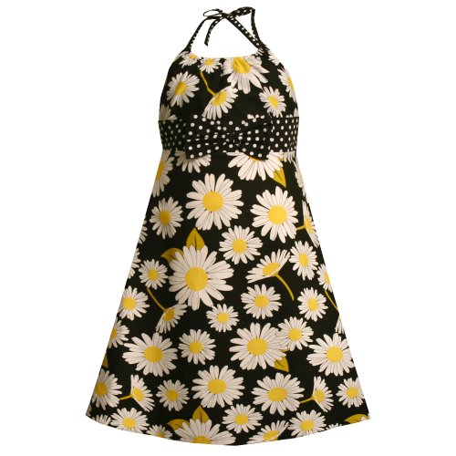 Beautiful BLACK & WHITE DAISY FLORAL PRINT HALTER DRESS features sleeveless bodice with BLACK/WHITE POLKA DOT STRAPS that tie behind the neck and matching BLACK/WHITE POLKA DOT INSET & CENTER BOW TRIM at the EMPIRE WAIST. EMPIRE WAIST BLACK SKIRT features WHITE/YELLOW DAISY FLOWER PRINT with stretchable band in back for comfortable fit and BLACK/WHITE POLKA DOT BOW TIE SASH IN BACK for perfect fit. Machine washable. Imported (Sri Lanka). Of 100% cotton - Lining of polyester/cotton - Exclusive of trim/decoration. Matching/Coordinating sister styles available in sizes 12M-20.5, search for style(s): BNJ-9531. More baby & girl party dresses available, search for: " bnj-girl-party-dress " Read more...