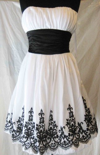 Strapless white short prom dress, wide black empire waist band, black embroidery skirt trim, Fully lined with built in bra. Read more...