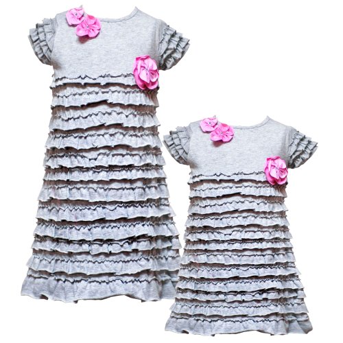 Beautiful GREY TIERED RUFFLE KNIT DRESS features round neckline with PINK JEWELED-FLOWER APPLIQUE at the front bodice and TIERED RUFFLE TRIM at the cap sleeves plus key-hole button closure behind neck. Hand wash, line dry. Imported. Imported. Of cotton/polyester - Exclusive of trim/decoration. Matching/Coordinating sister styles available in sizes 2T-16, search for style(s): RRE-45121. More baby & girl party dresses available, search for: " rre-girl-party-dress " Read more...
